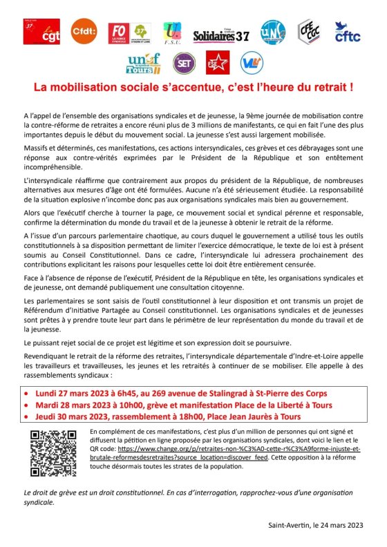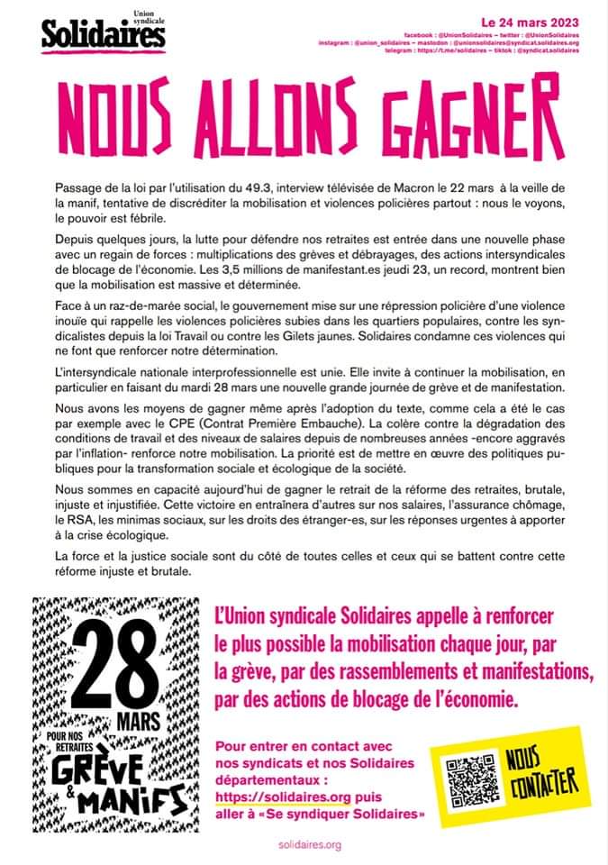 đ Nous allons gagner ! Les prochains rdv : đ Lundi : 6h45 avec les cheminot.es au 269 avenue Stalingrad Ă Saint Pierre des Corps đ Mardi : 10h manif place de la LibertĂ© đ Jeudi : 18h rassemblement place Jean JaurĂšs