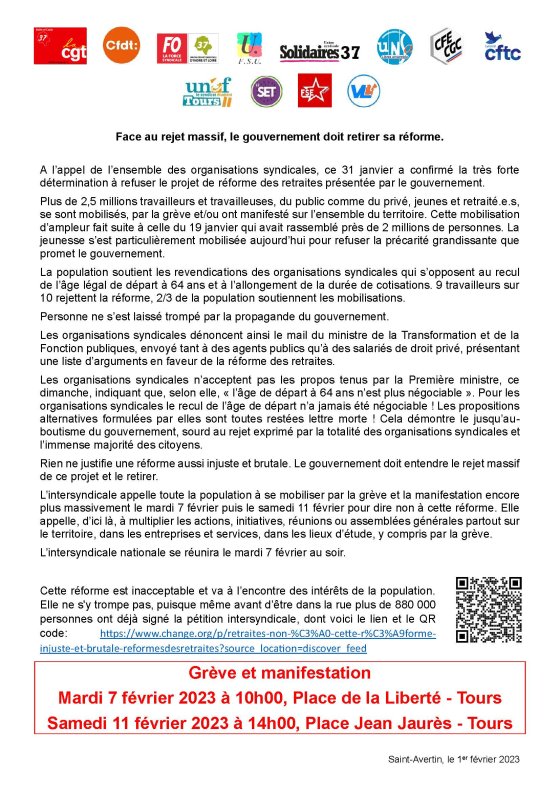 đ Rdv Ă 10h le mardi 7 fĂ©vrier place de la LibertĂ© Ă Tours ! đ Rdv Ă 14h le samedi 11 fĂ©vrier place Jean JaurĂšs Ă Tours ! đ Ni amendable, ni nĂ©gociable, retrait du projet de rĂ©forme des retraites ! đ Discutons en AG dans nos boĂźtes de la possibilitĂ© de reconduire la grĂšve toutes et tous ensemble ! đ Mettons en place des caisses de grĂšve solidaires pour tenir ! Tracts intersyndical et tract solidaires ci-dessous