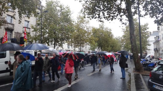 A l’appel de la CGT, de Sud et de la FSU, plusieurs centaines de manifestants opposés à la réforme des retraites ont défilé ce matin en centre-ville de Tours. Le cortège s’était rassemblé place de la Liberté avant d’emprunter l’avenue de Grammont pour rejoindre la place Jean-Jaurès, sous une pluie incessante. Cette météo maussade explique sans doute en partie la faible mobilisation des troupes".