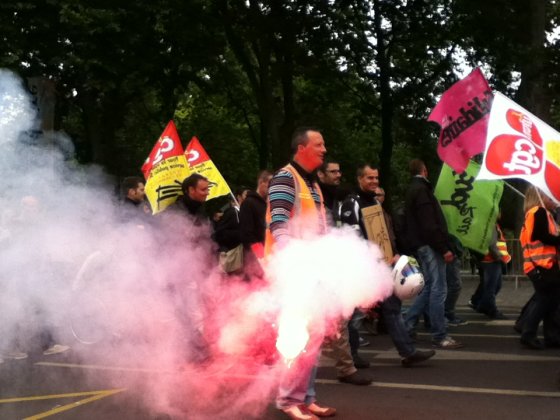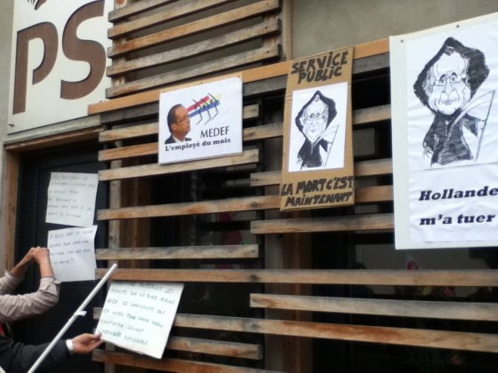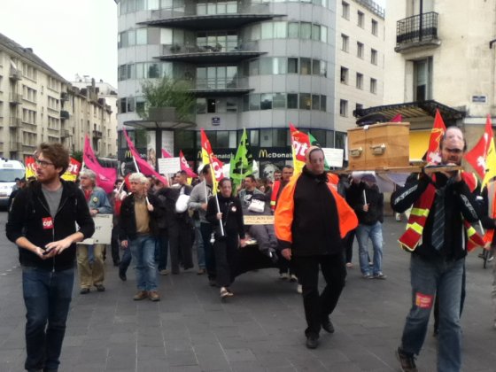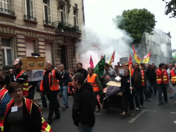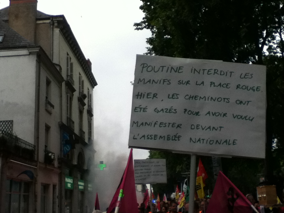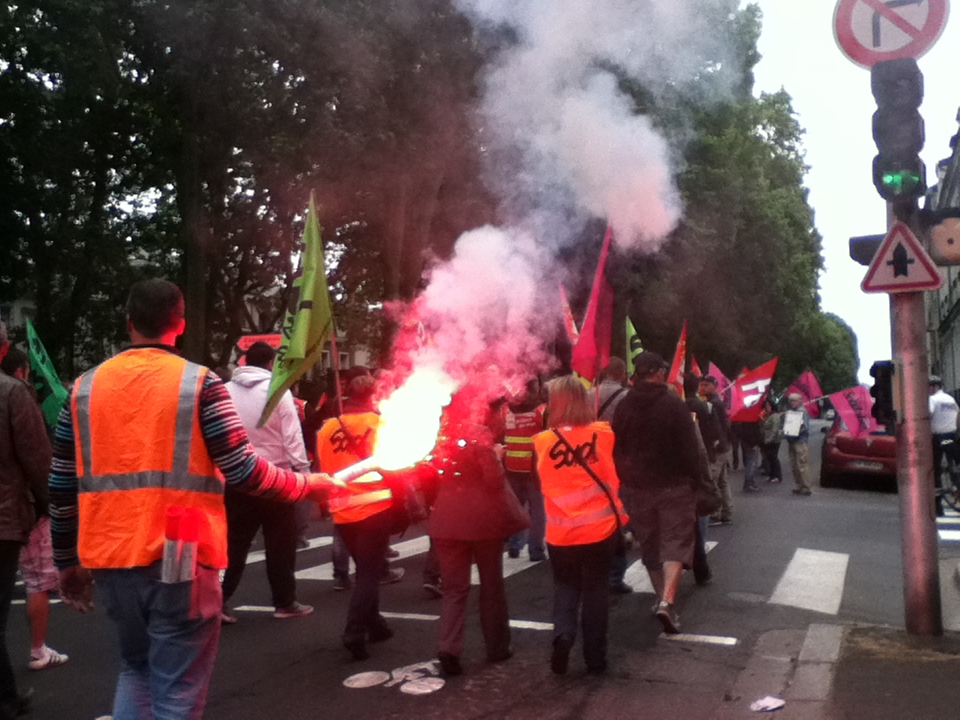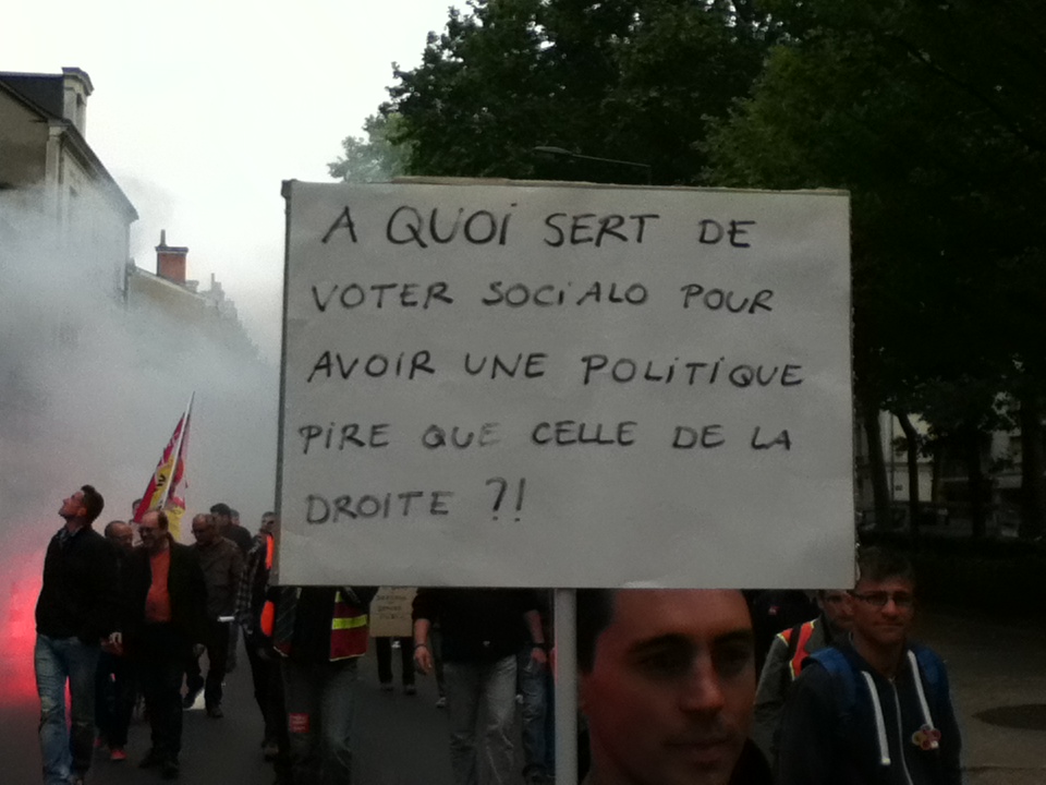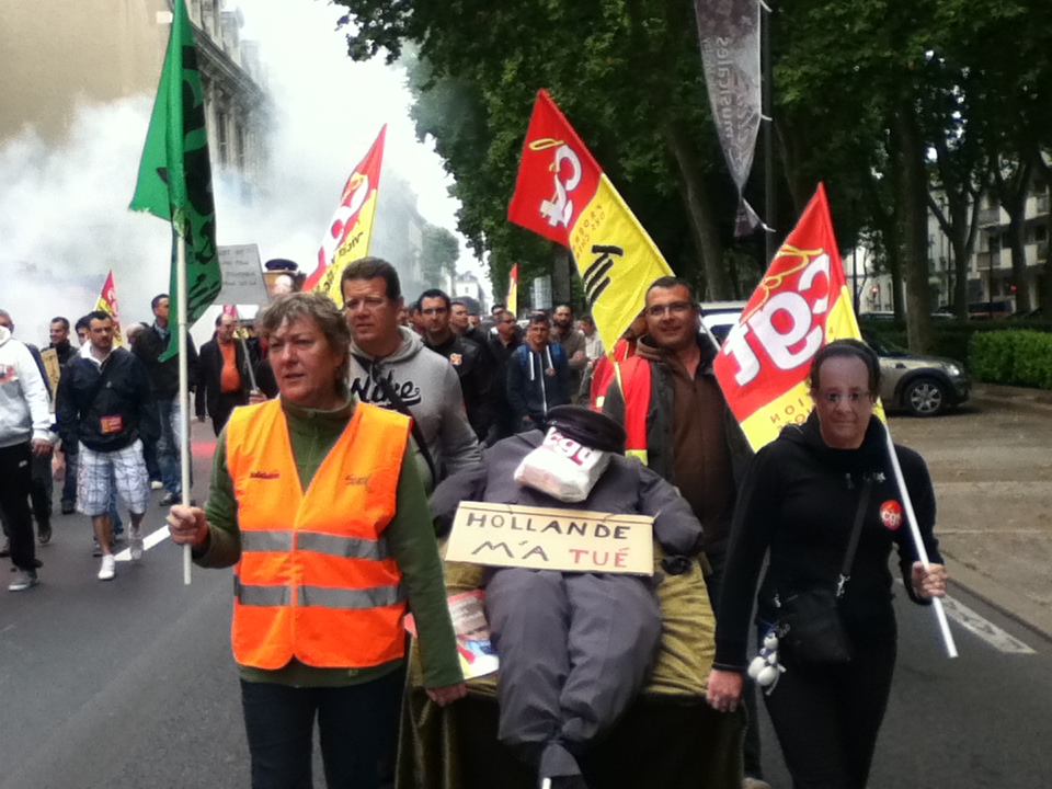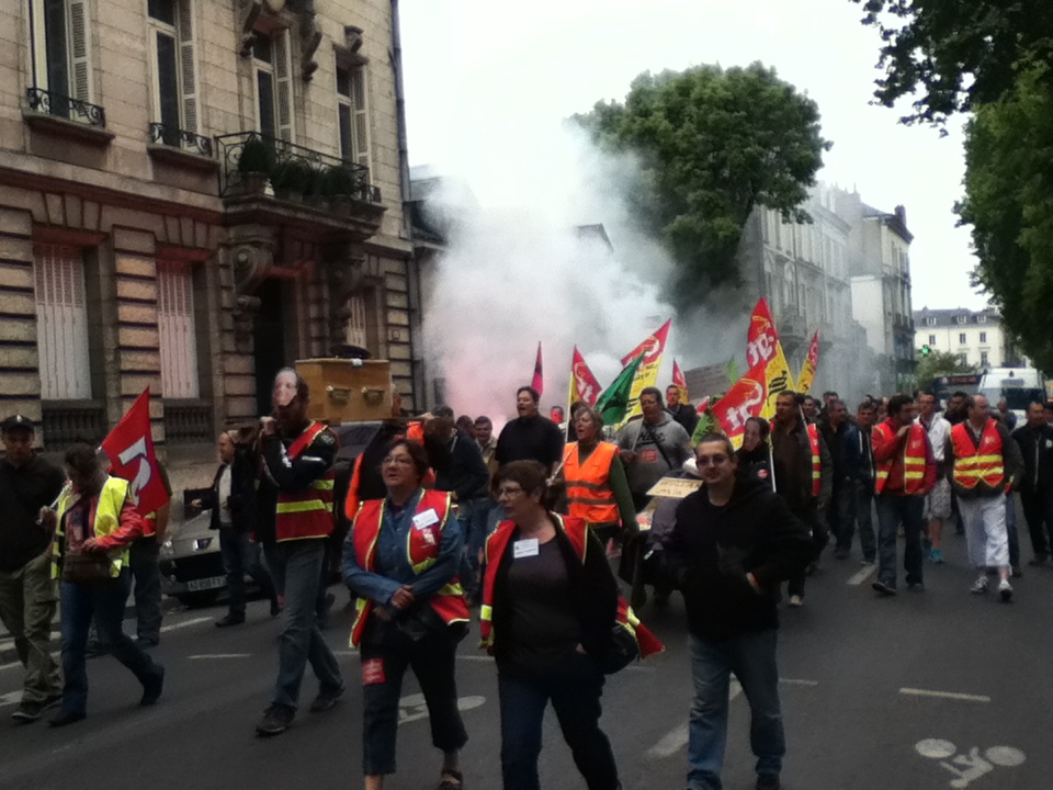 Plus tôt dans la matinée, quelque 130 manifestants – un chiffre partagé par les syndicats et la police – ont battu le pavé, sous les bannières CGT, Sud et FO. Parti depuis la Maison des cheminots, rue Blaise-Pascal, le cortège s’est d’abord rendu au siège du Parti socialiste, situé rue de la Fuye, pour y déposer une motion. « Toutes les réformes que Sarkozy n’a pas osé mener, Hollande les fait », confie un manifestant.