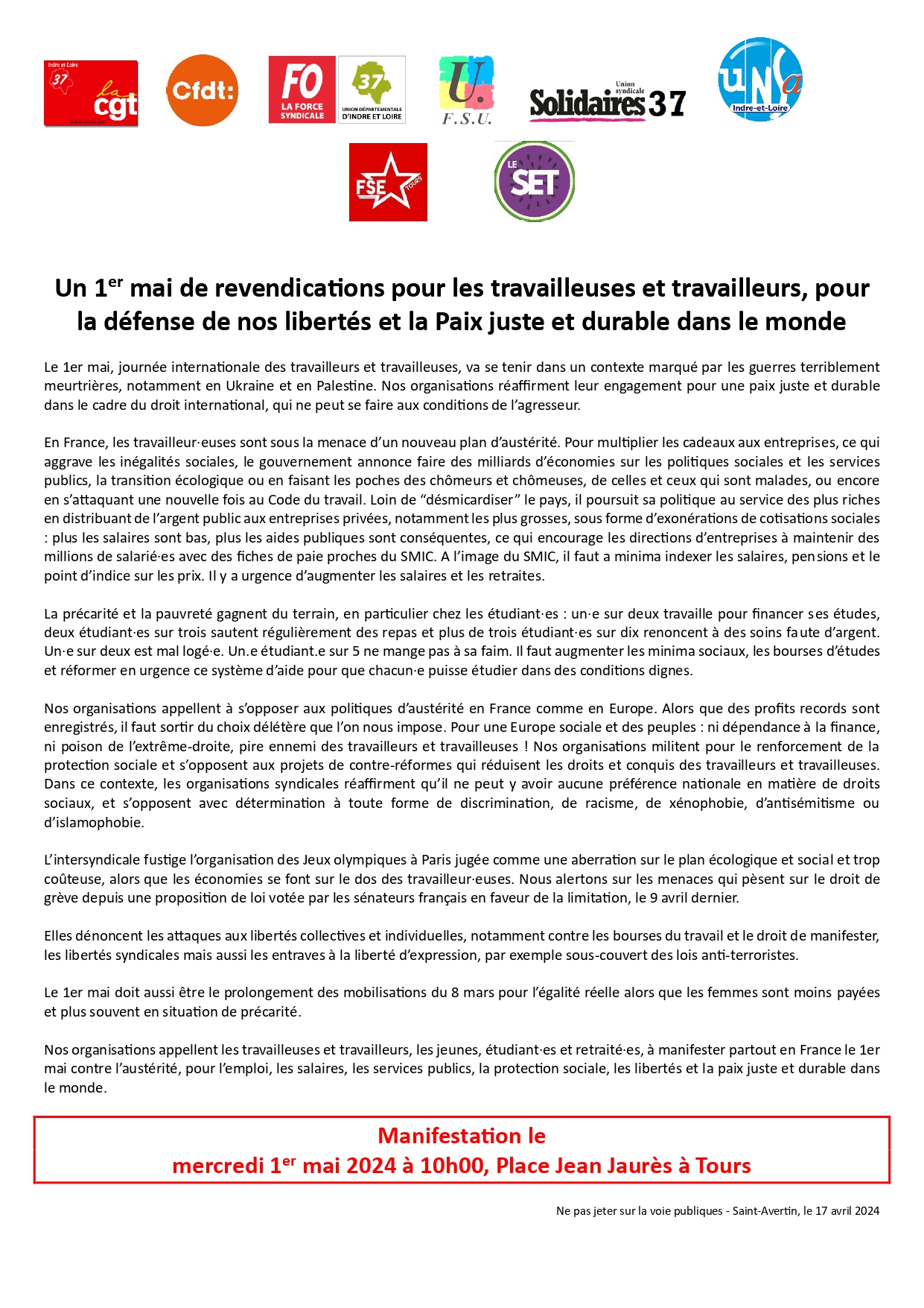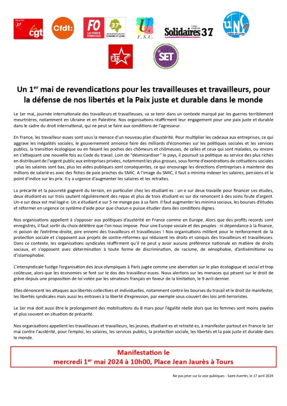 * Manifestation interprofessionnelle à 10h place Jean Jaurès à Tours