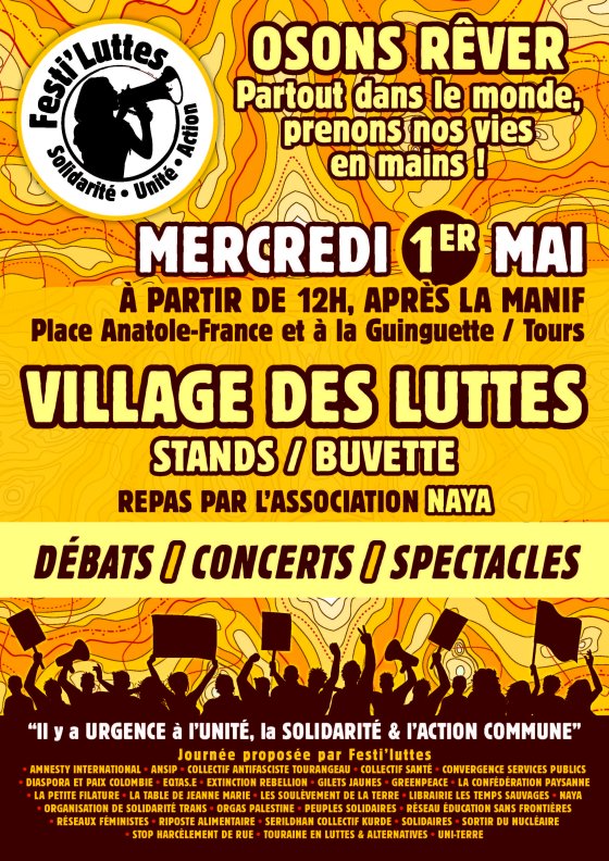 * Festi’Luttes à partir de 12h, place Anatole France et Guinguette à Tours (Village des luttes, stands, buvette, repas et concerts)