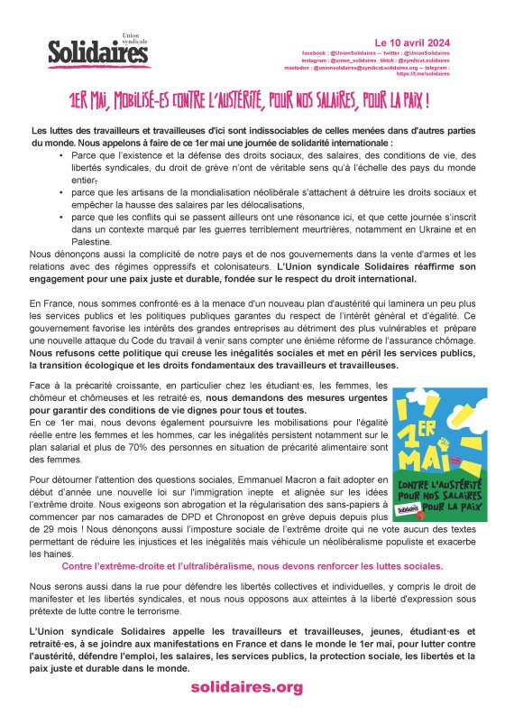 1er mai, partout dans le monde, prenons nos vies en mains ! Contre l’austérité, pour nos salaires et une paix jute et durable !