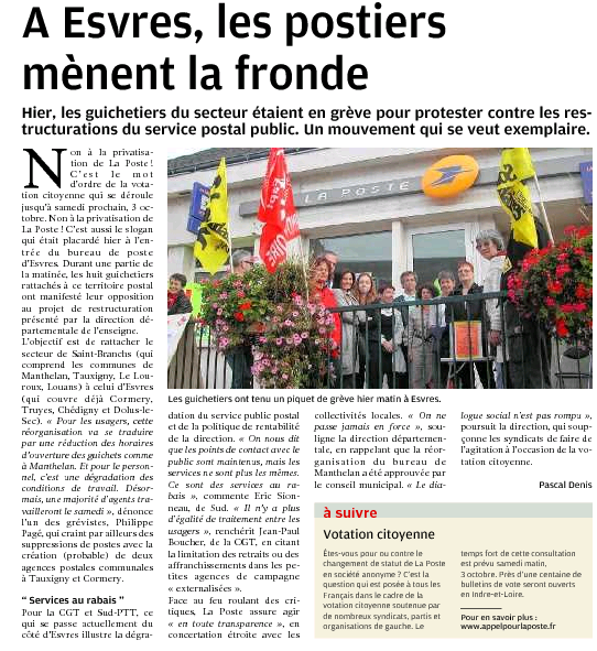 Pour la CGT et Sud-PTT, ce qui se passe actuellement du côté d’Esvres illustre la dégradation du service public postal et de la politique de rentabilité de la direction. « On nous dit que les points de contact avec le public sont maintenus, mais les services ne sont plus les mêmes. Ce sont des services au rabais », commente Eric Sionneau, de Sud. « Il n’y a plus d’égalité de traitement entre les usagers », renchérit Jean-Paul Boucher, de la CGT, en citant la limitation des retraits ou des affranchissements dans les petites agences de campagne « externalisées ».