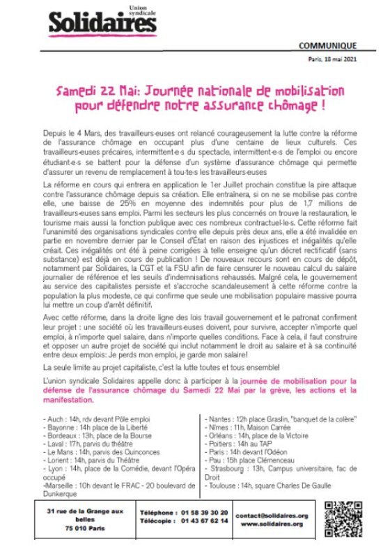 Abrogation de la réforme de l’assurance chômage, rdv à 14h place de la préfecture le samedi 22 mai