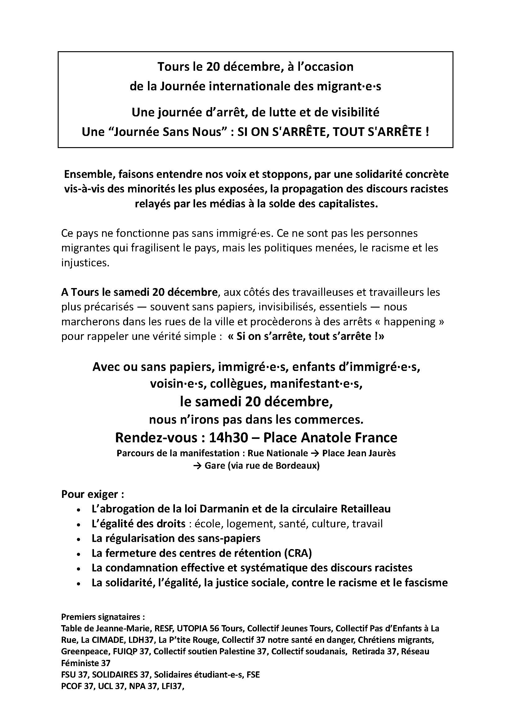 Appel unitaire Tours 20 décembre, Journée internationale des migrant·e·s, rdv 14h30 place Anatole France