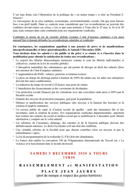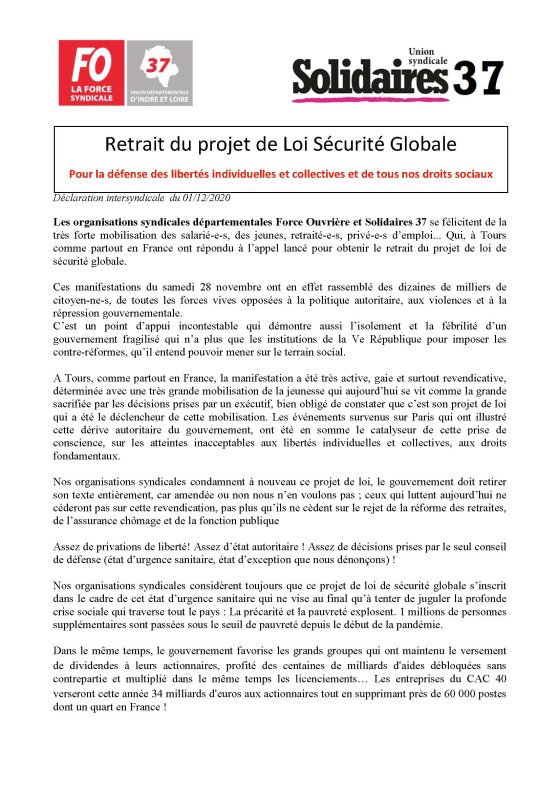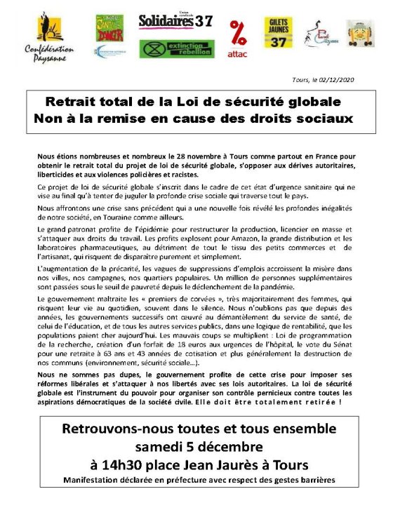 Appels unitaires Festi’Luttes et Solidaires/FO manifestation samedi 5 décembre 14h30 place Jean jaurès