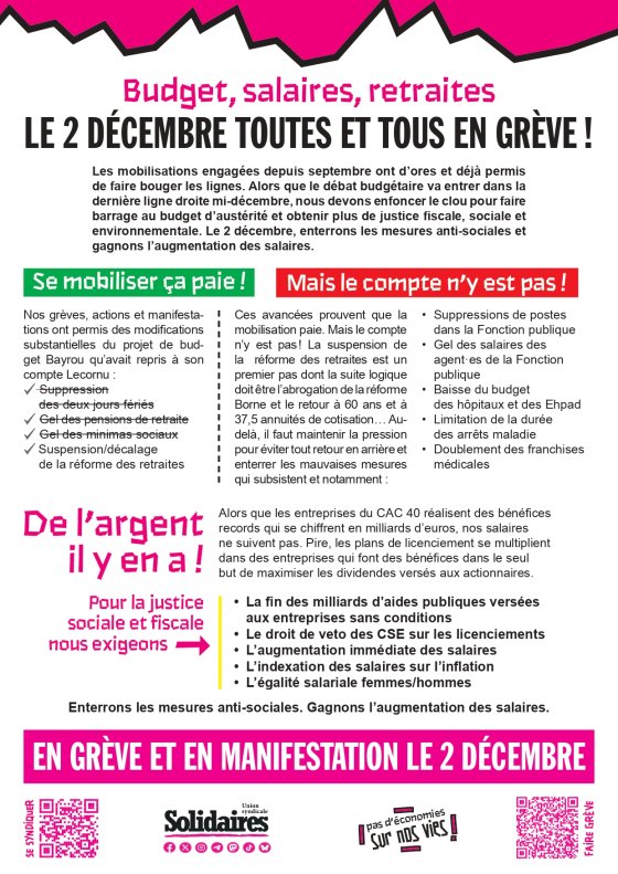 BUDGET, SALAIRES, RETRAITES : LE 2 DÉCEMBRE TOUTES ET TOUS EN GRÈVE ET MANIFESTATION ! RDV à 10h DEVANT L’ARS