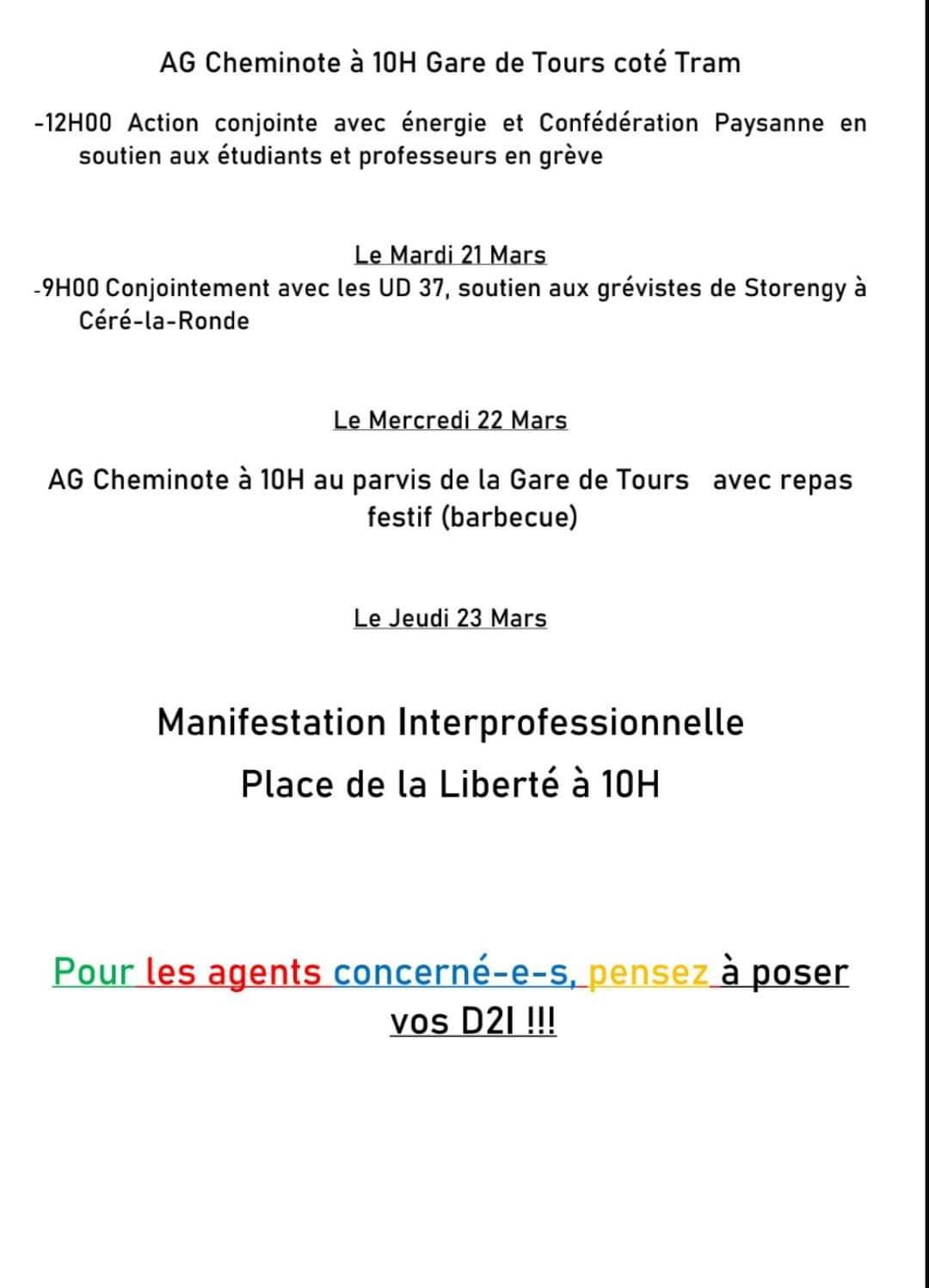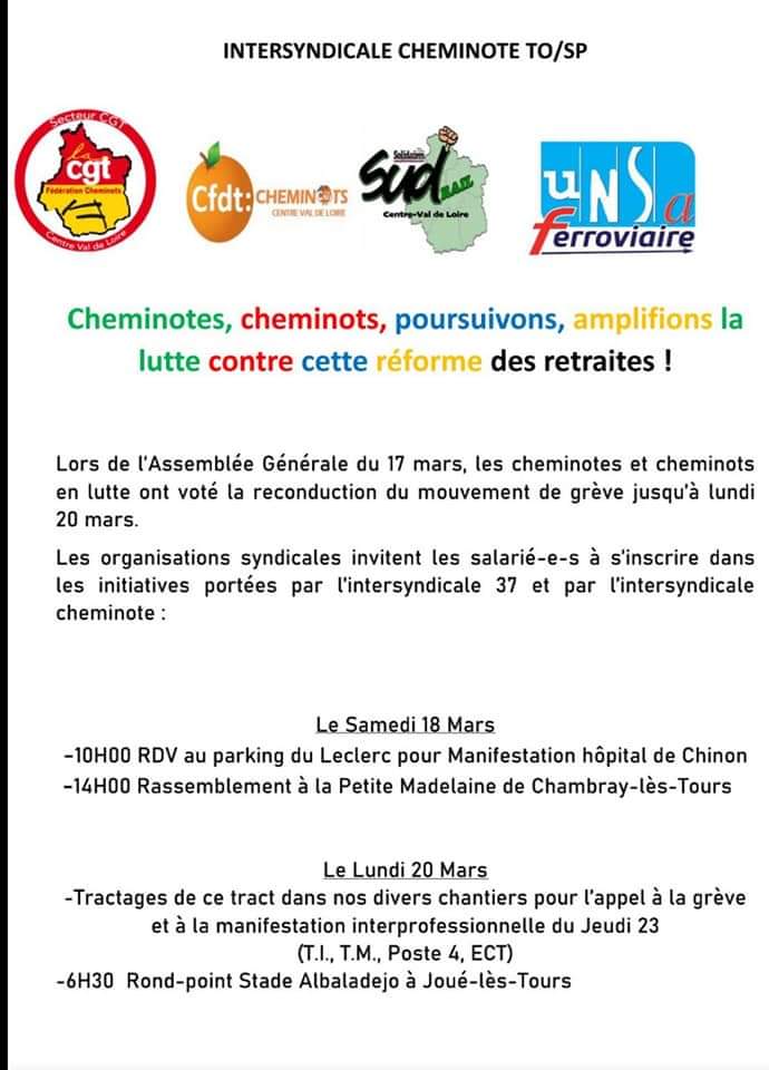 Récapitulatif des actions de l’intersyndicale cheminote, à soutenir : Le Lundi 20 Mars -Tractages de ce tract dans nos divers chantiers pour l’appel à la grève et à la manifestation interprofessionnelle du Jeudi 23 (T.I., T.M., Poste 4, ECT) - 6H30 Rond-point Stade Albaladejo à Joué-lès-Tours AG Cheminote à 10H Gare de Tours coté Tram - 12H00 Action conjointe avec énergie et Confédération Paysanne en soutien aux étudiants et professeurs en grève Le Mardi 21 Mars - 9H00 Conjointement avec les UD 37, soutien aux grévistes de Storengy à Céré-la-Ronde Le Mercredi 22 Mars - AG Cheminote à 10H au parvis de la Gare de Tours avec repas festif (barbecue) - Le Jeudi 23 Mars Manifestation Interprofessionnelle Place de la Liberté à 10H