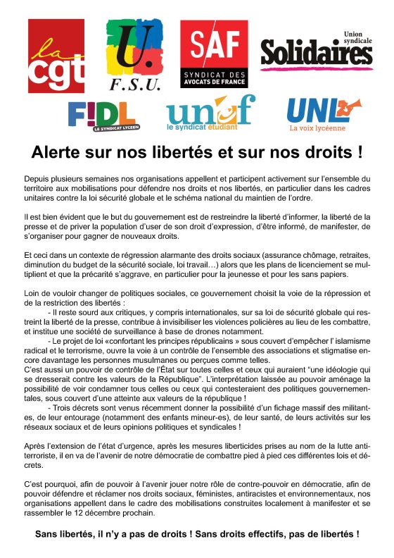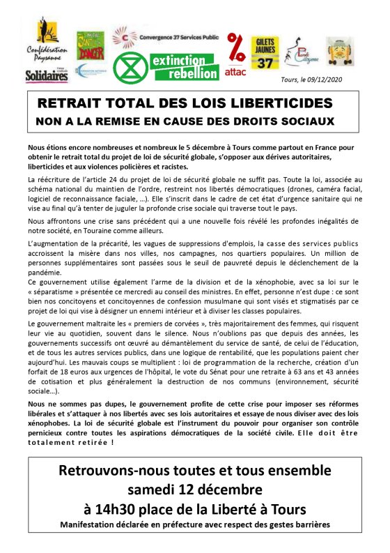 Contre la loi « sécurité globale » et les lois liberticides, pour la défense des droits sociaux, toutes et tous ensemble le samedi 12 décembre à 14h30 Place de la Liberté à Tours !