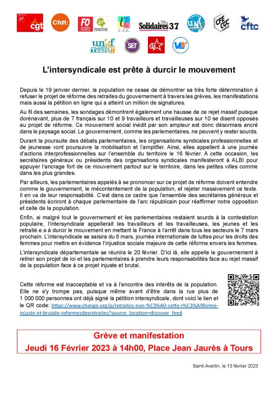 RDV jeudi 16 février à 14h place Jean Jaurès. Appels intersyndical et solidaires ci-dessous