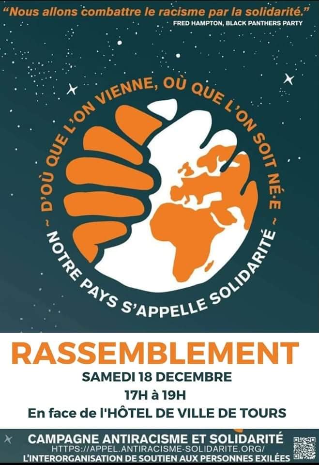 Dans le cadre de la journée internationale des migrant·es, mobilisation le 18 décembre à partir de 17h place Jean Jaurès à Tours contre toutes les formes de racisme, pour la liberté de circuler et de manifester, l’égalité des droits, la dignité et la solidarité, en particulier avec les migrant-es.