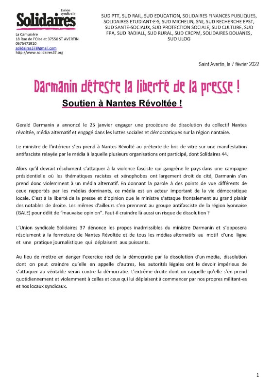 Darmanin déteste la liberté de la presse, communiqué de soutien au média alternatif Nantes Révoltée !
