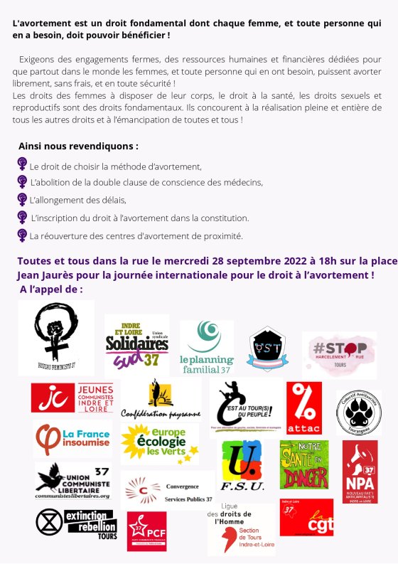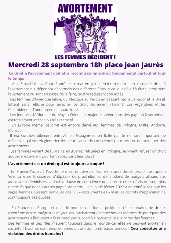Défendre le droit à l’avortement, partout, tout le temps, pour toutes ! Manifestation mercredi 28 septembre 18h place Jean Jaurès