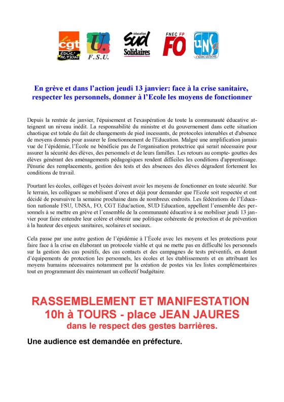 Face à la crise sanitaire, respecter les personnels, donner à l’Ecole les moyens de fonctionner, jeudi 13 janvier rdv à 10h place Jean Jaurès