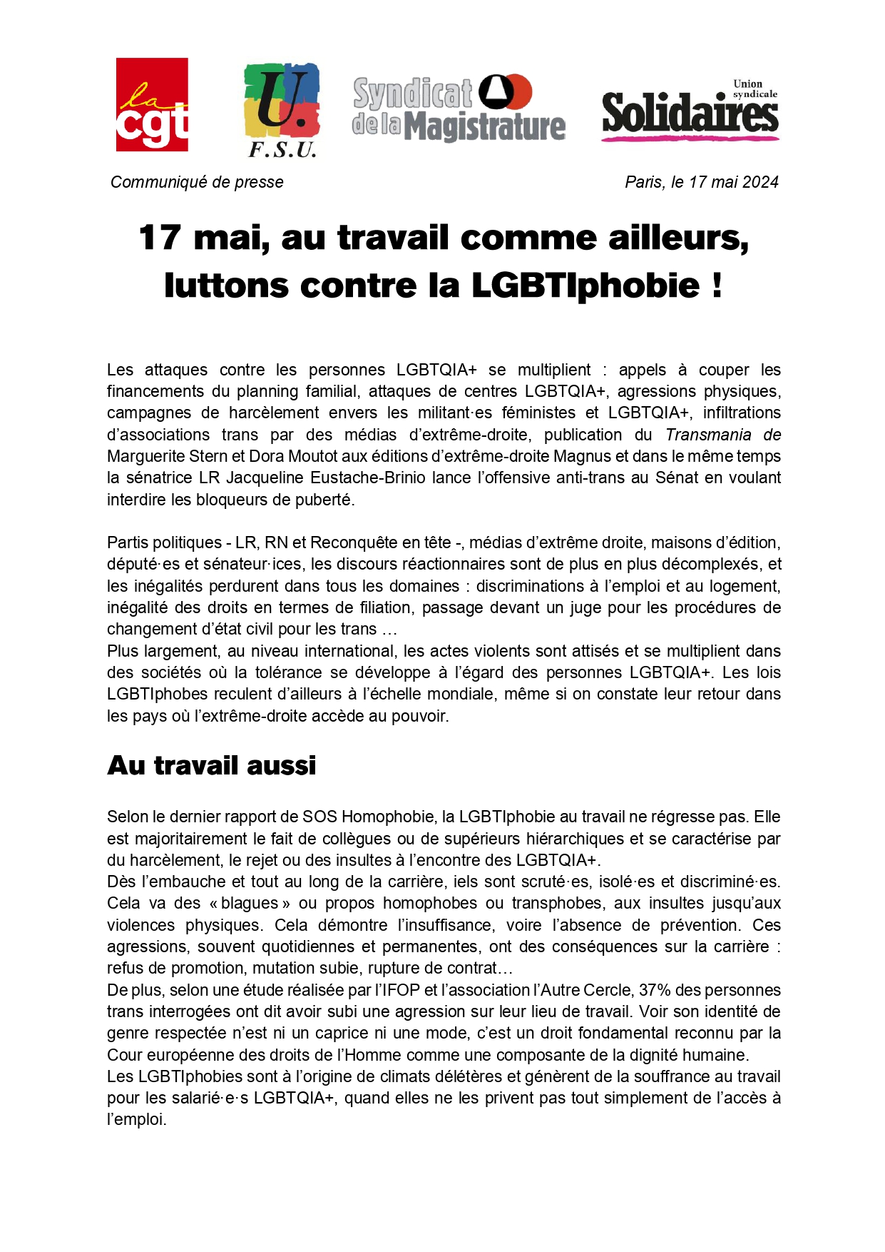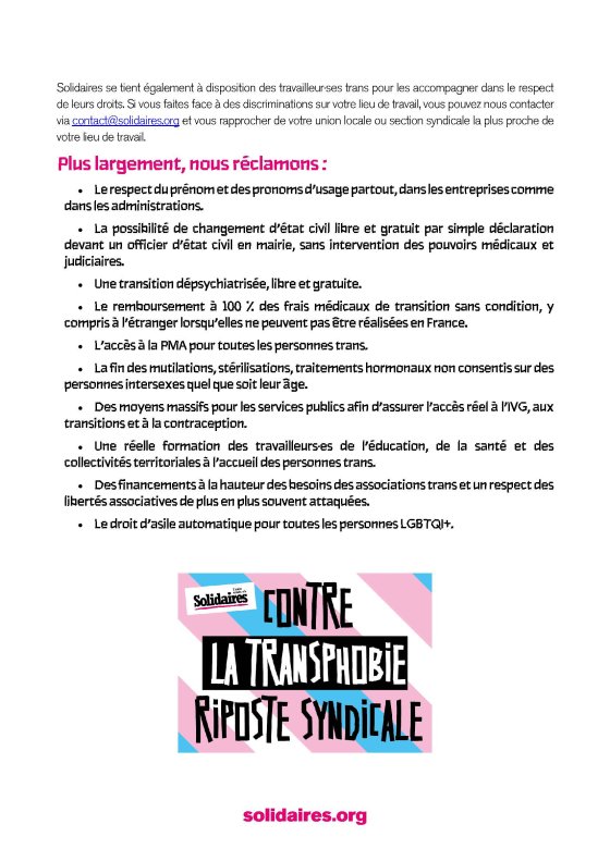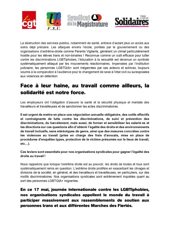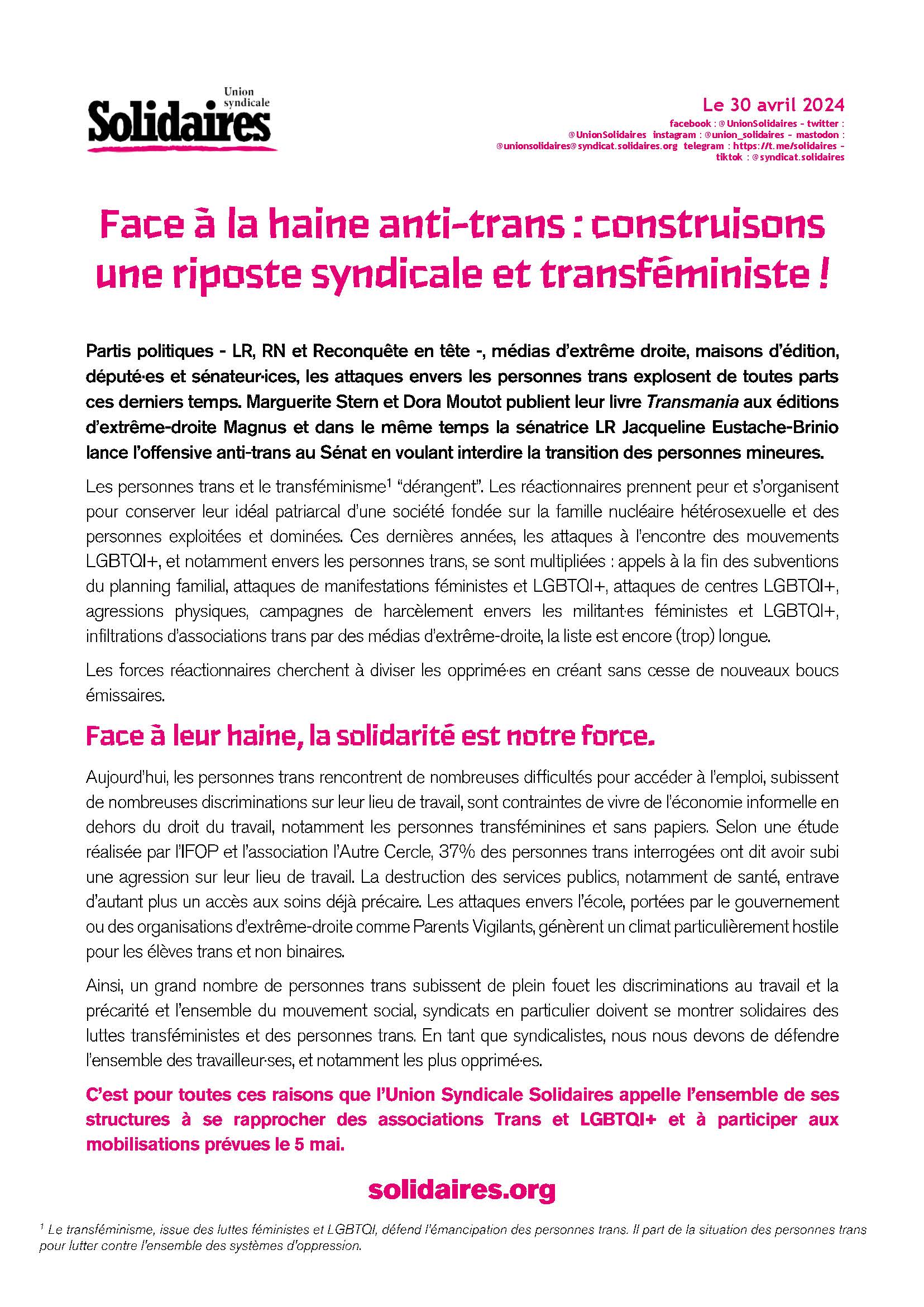 Face à la transphobie, construisons une risposte syndicale et transféministe ! Appel à rassemblement samedi 26 mai à 15h place Jean Jaurès à l’initiative de l’OST