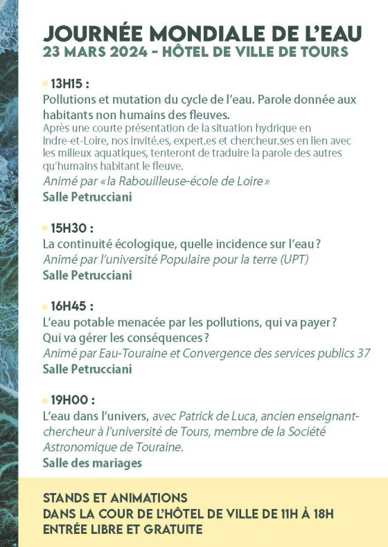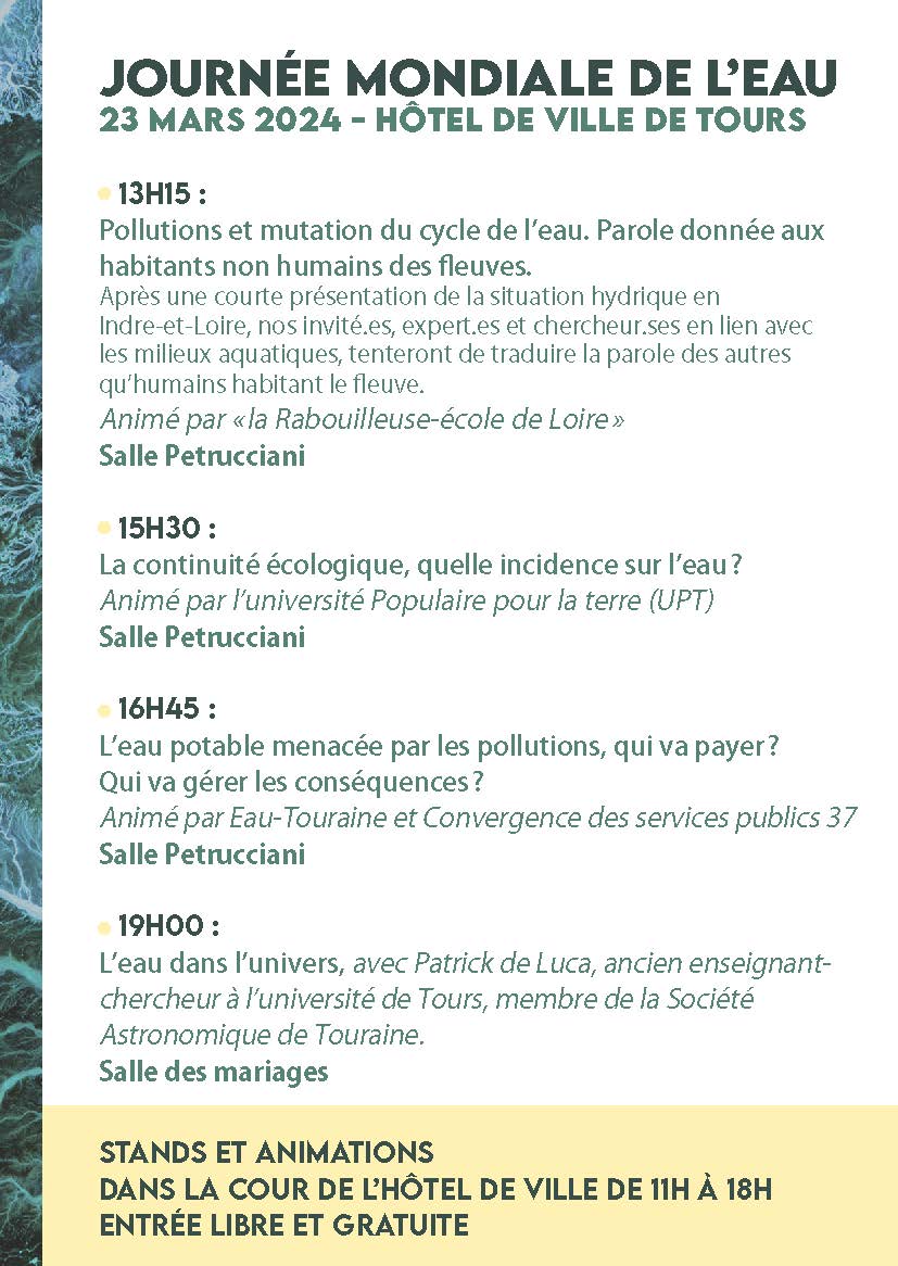 Journée mondiale de l’eau samedi 23 mars de 11h à 21h, cour Hôtel de ville Tours