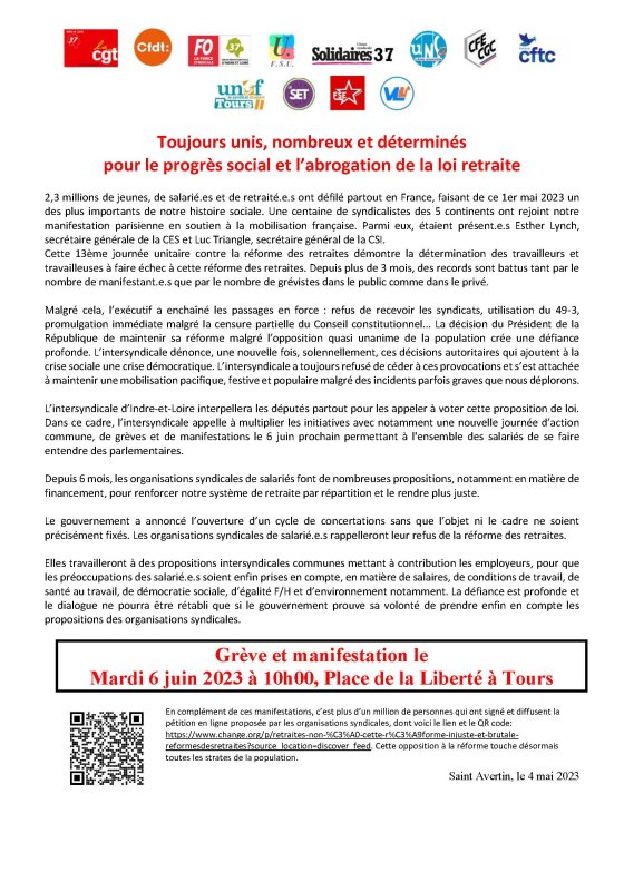 LE 6 JUIN POUR NOS RETRAITES ET POUR LE PROGRÈS SOCIAL, RDV à 10h place de la Liberté à Tours