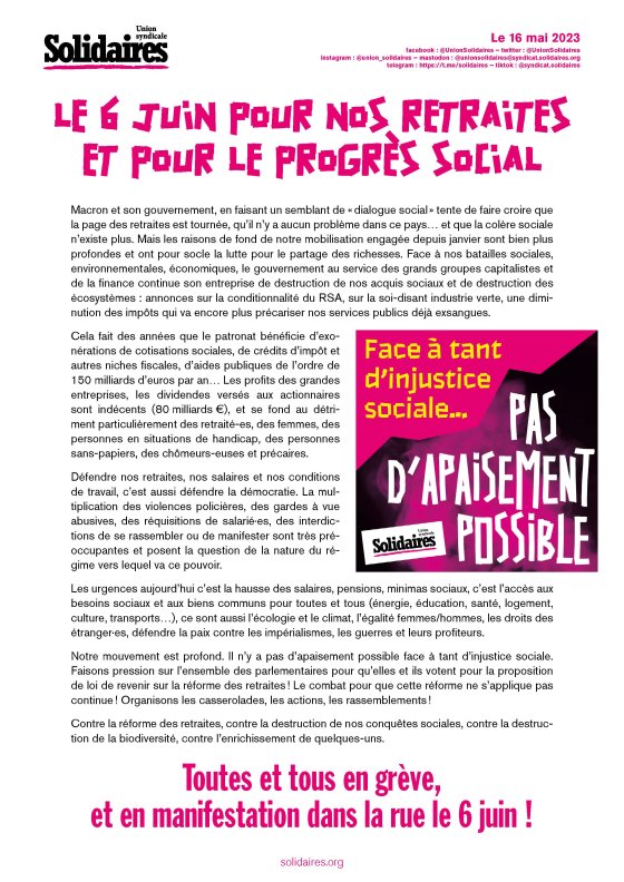 👊 Le 6 juin pour nos retraite et pour le progrès social toutes et tous en grève et dans la rue !