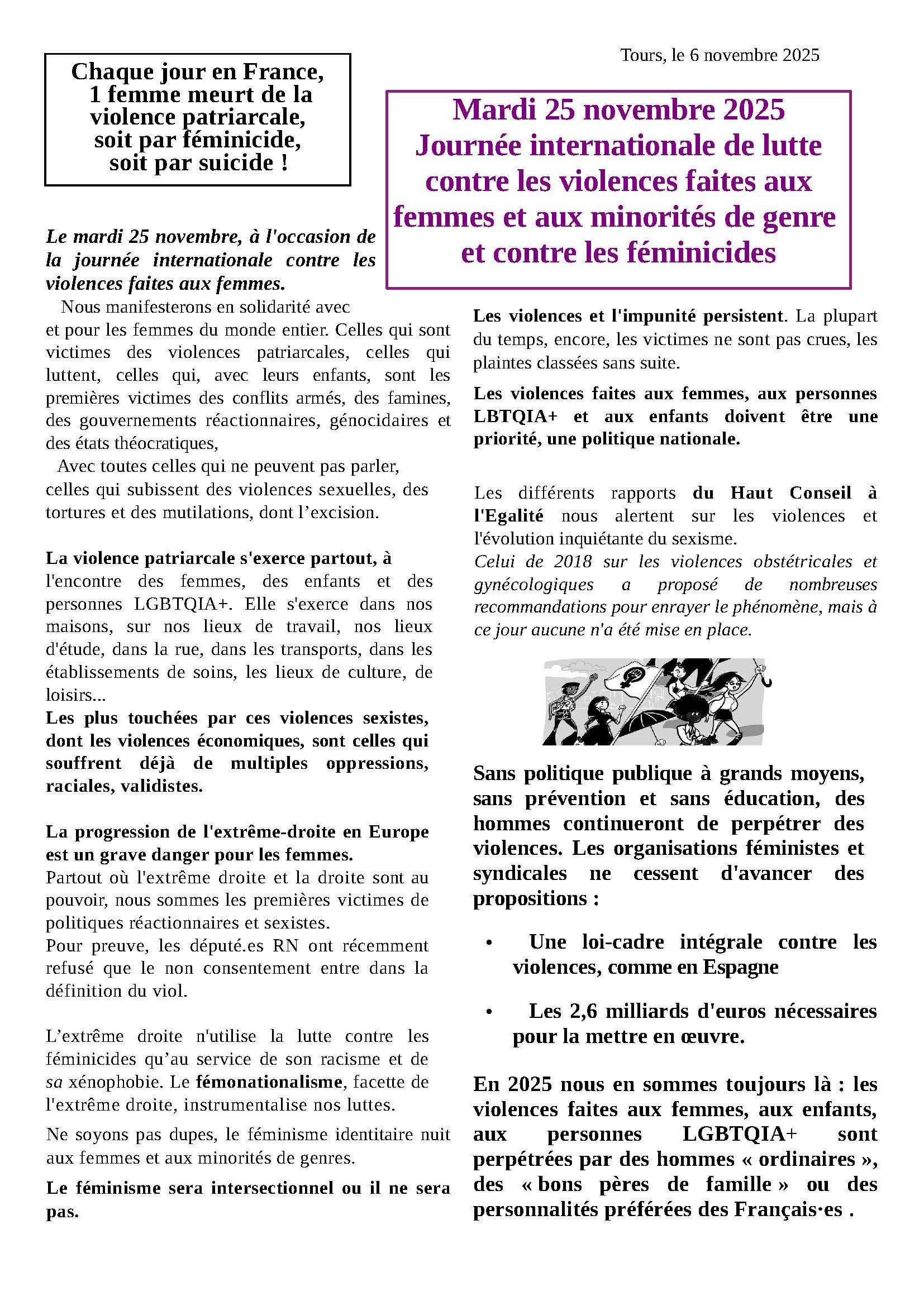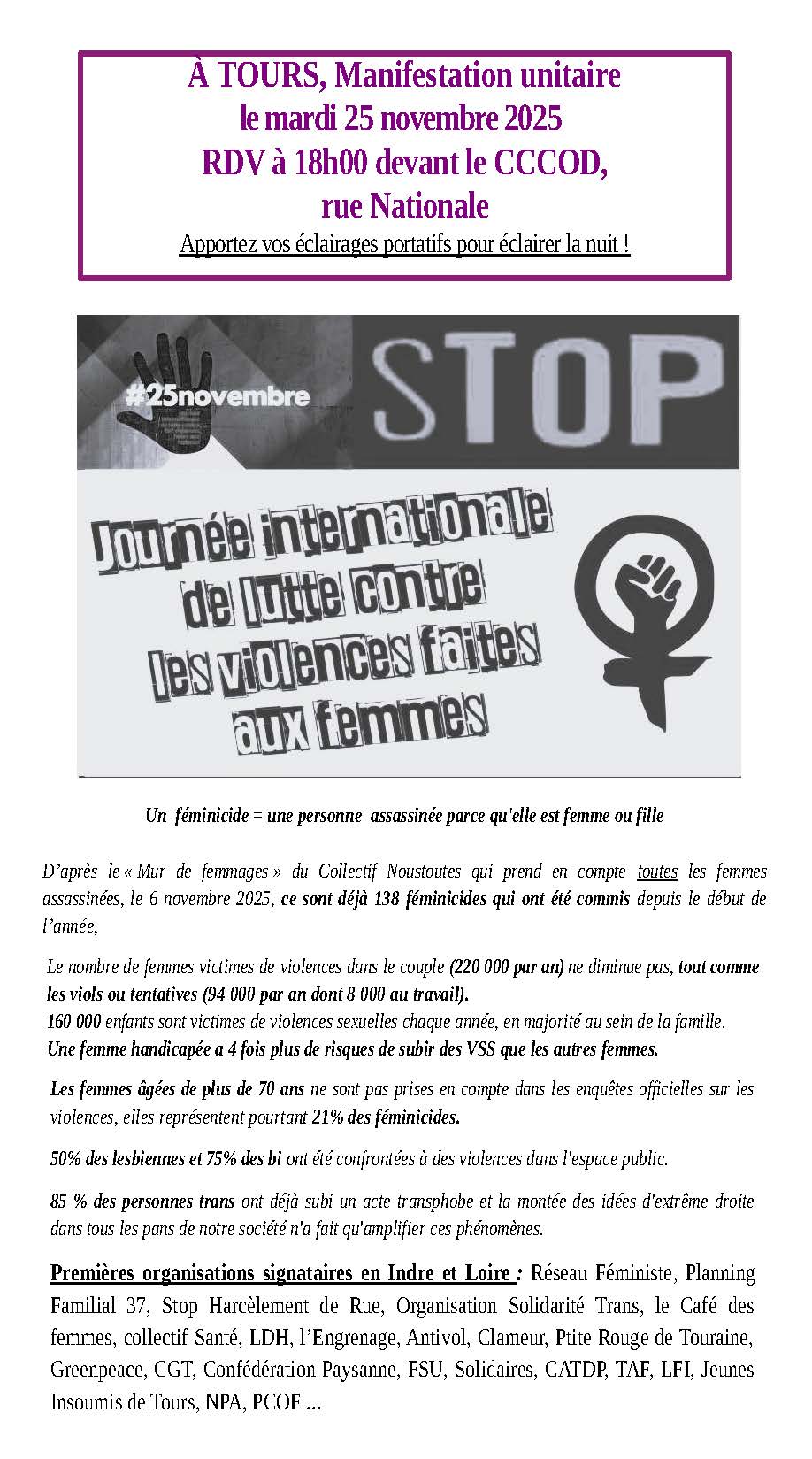 LUTTE CONTRE LES VIOLENCES PATRIARCALES FAITES AUX FEMMES ET AU MINORITES DE GENRE : NOUS NE VOULONS PLUS ATTENDRE ! Manifestation unitaire le mardi 25 novembre, rdv à 18h devant le CCCOD à Anatole France à Tours