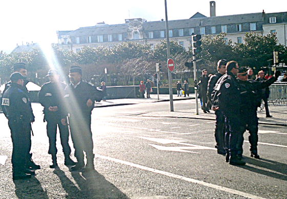 Sur la photo ci dessous, le petit à gauche qui discute avec 3 autres flics, avec un calot sur la tête et une barbiche, c’est Alphonse Chami, l’ancien responsable des RG des Deux Sèvres. Il dirige actuellement le service de « police de proximité » de Tours et hait les « gauchistes » (une habitude au commissariat de Tours). A droite, un peu plus loin, les mains dans le dos et en train de discuter avec 2 autres keufs, c’est le fameux Olivier Le Gouetsre, Directeur Départemental du mensonge public ! Notons que les deux, sur ce cliché, se sont effectivement déguisés en flics !