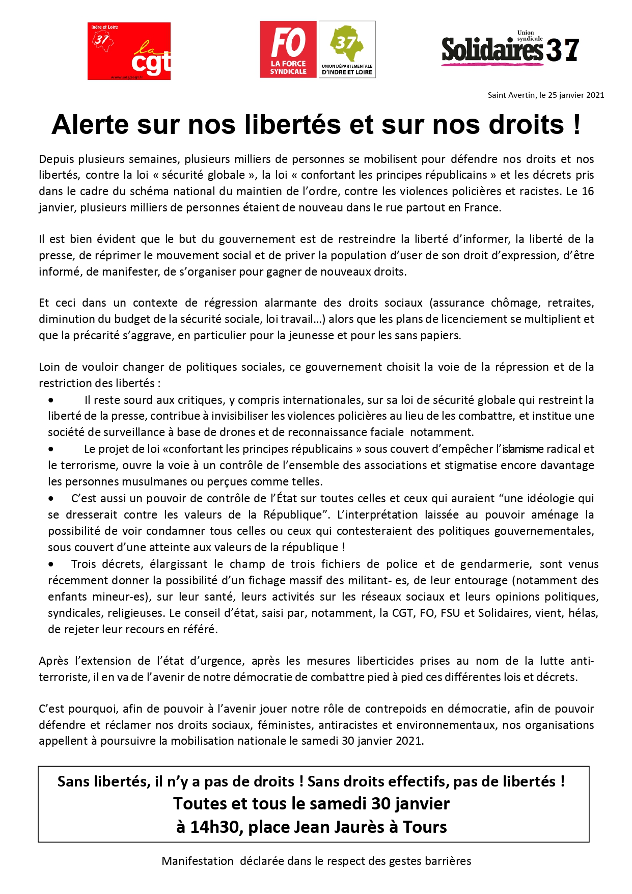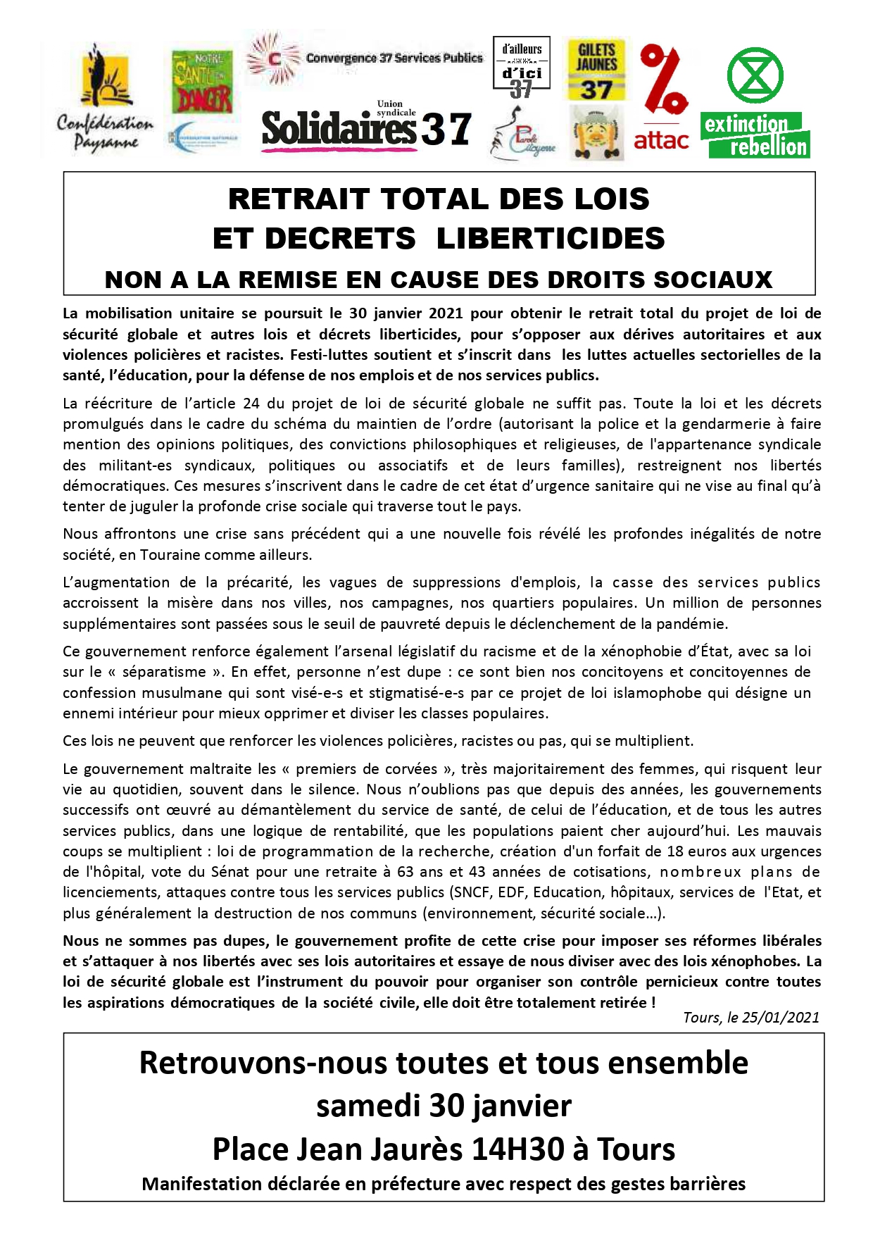 La mobilisation contre les lois liberticides se poursuit ! RDV samedi 30 janvier à 14h30 place Jean Jaurès à Tours !