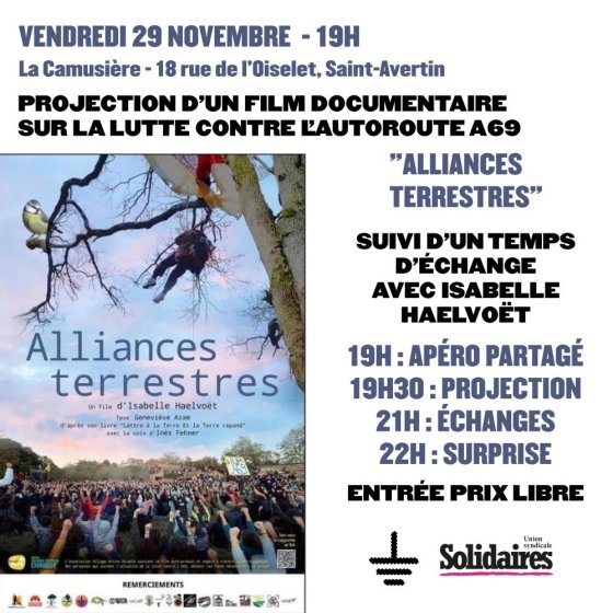 Le comité local des soulèvements de la terre de Tours et Sud-Solidaires 37, vous invite pour la projection du film documentaire Alliances Terrestres le vendredi 29 novembre à 19h, un film documentaire sur la lutte contre l’autoroute A69 en présence de la réalisatrice.