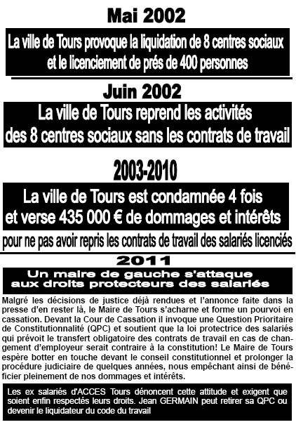 Les ex salariés d’ACCES Tours dénoncent l’attitude scandaleuse de la Ville de Tours dans son acharnement contre le droit de salariés licenciés et contre son attaque des droits protecteurs des salariés inscrits dans le code du travail.