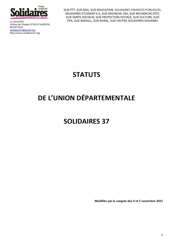 Statuts de Solidaires 37 modifiés congrès novembre 2021