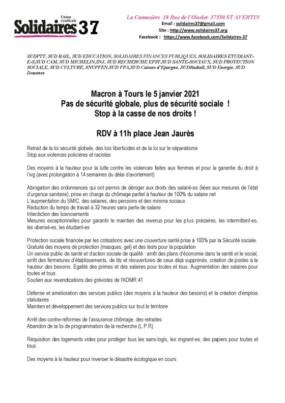 Macron à Tours le 5 janvier 2021 Pas de sécurité globale, plus de sécurité sociale ! Stop à la casse de nos droits ! RDV à 11h place Jean Jaurès