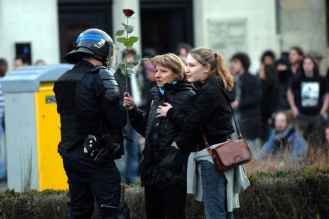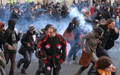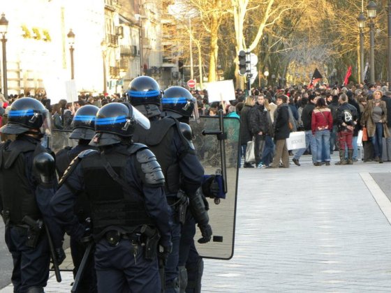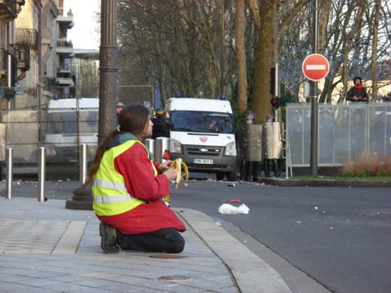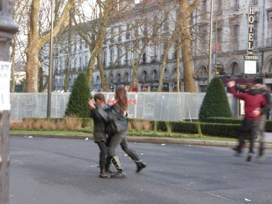 Cherchant à évacuer la place, les autorités ont tiré des bombes lacrymogènes (certes « légères » mais très irritantes), avant deux premières arrestations. Volaient alors des pavés de plus d’un kilo, à quelques mètres d’intrépides journalistes. La nuit tombée, deux camions équipés de canons à eau ont sillonné le début de l’avenue Grammont, où deux poubelles avaient été incendiées. Sortant des magasins, de nombreux adeptes des soldes avec des poussettes se sont retrouvés pris en étau, la police encerclant les derniers manifestants. Vers 19 h 30, les militaires progressaient « en tortue » pour terminer l’évacuation du centre-ville. La nuit s’annonçait tendue.