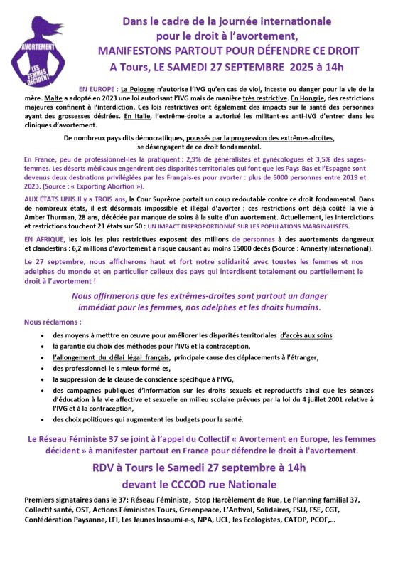 Manifestation pour le droit à l’IVG, samedi 27 septembre, 14h, CCCOD Tours !