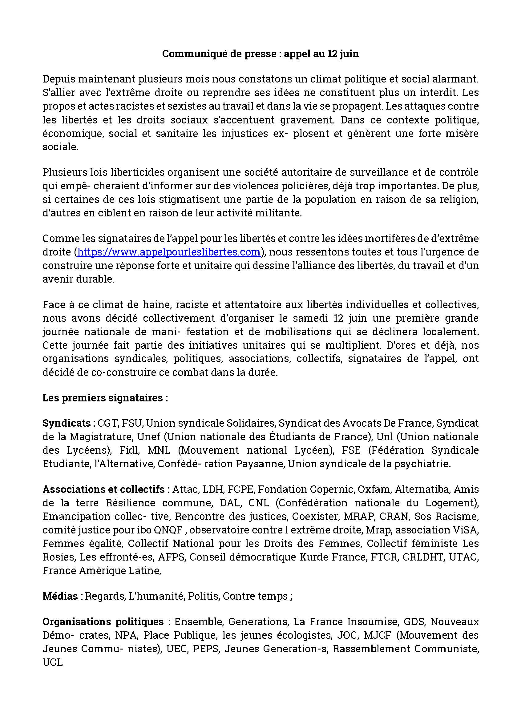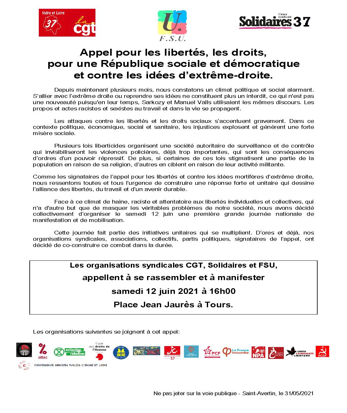 Mobilisation nationale pour les libertés, contre les idées d’extrème droite et le racisme le samedi 12 juin, rdv à 16h place Jean Jaurès à Tours