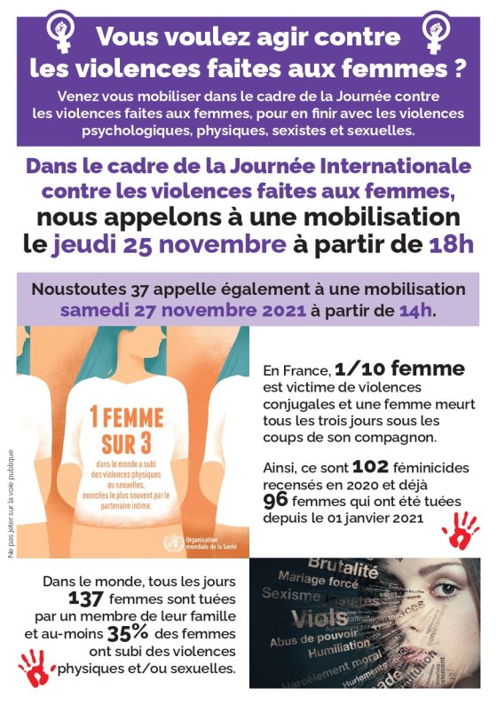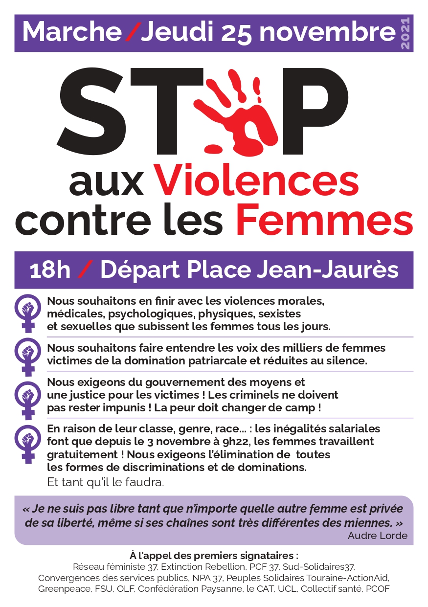 Partout dans le monde, stop aux violences sexistes et sexuelles ! Manifestation unitaire à 18h jeudi 25 novembre place Jean Jaurès à Tours