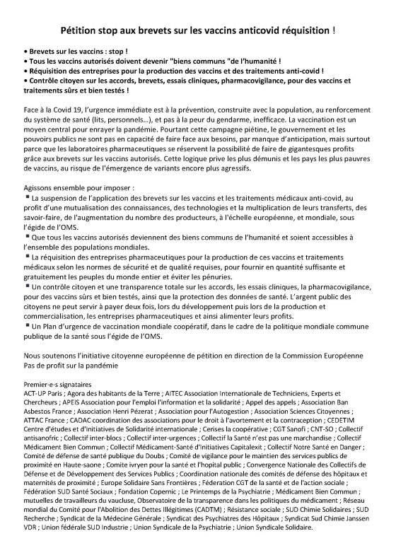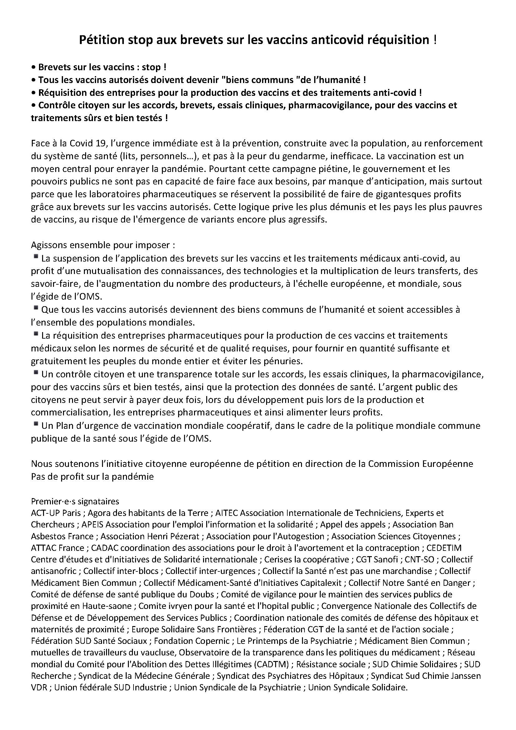 Pétition stop aux brevets sur les vaccins anticovid réquisition !
