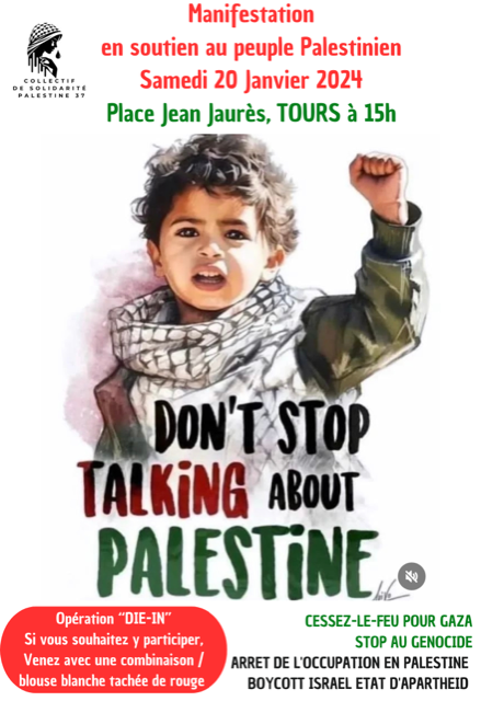 Prochain rassemblement de soutien à la Palestine samedi 20 janvier à 15h place Jean Jaurès.
