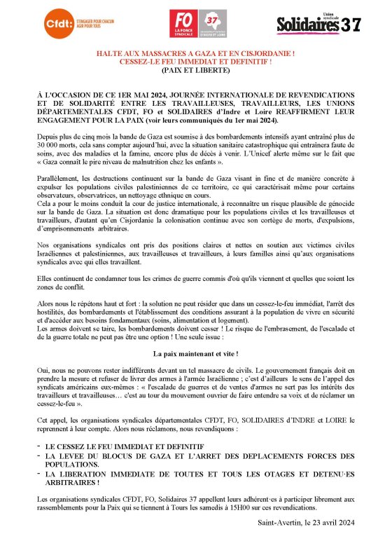 Appel du Collectif Palestine et communiqué intersyndical ci-dessous