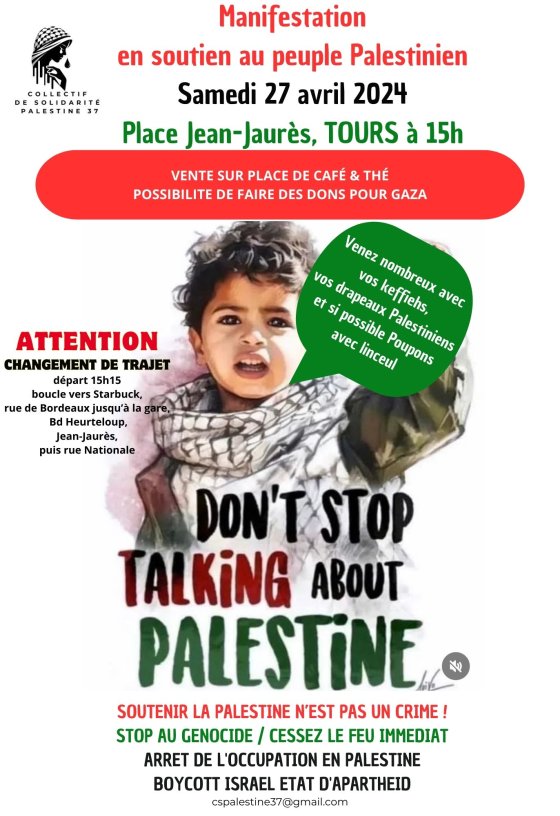 Prochaine manifestation de soutien à la Palestine samedi 27 avril 15h place Jean Jaurès.