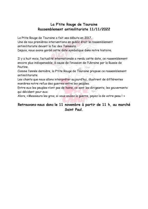 Rassemblement antimilitariste le 11 novembre à 11h marché Saint Paul à Tours organisé par la chorale militante La P’tite Rouge de Touraine