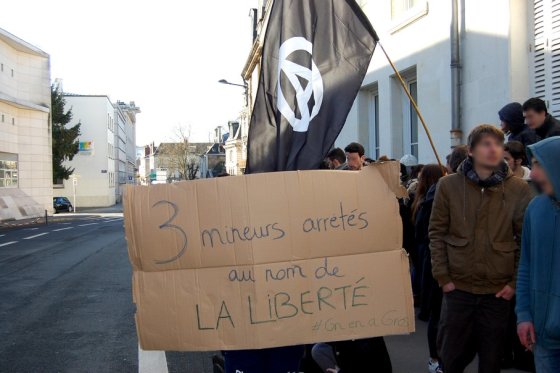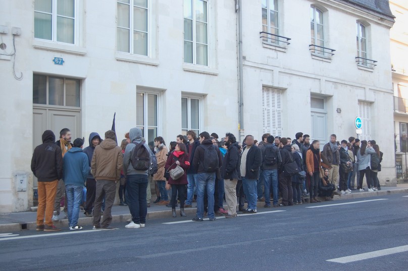 Ils sont à peu près soixante, essentiellement des lycéens ou étudiants mais aussi quelques adultes et représentants syndicaux, regroupés en face du commissariat depuis 9 h. « Nous sommes là en soutien à nos trois amis convoqués ce matin qui servent de bouc émissaire […] C’est de l’acharnement contre les jeunes. »