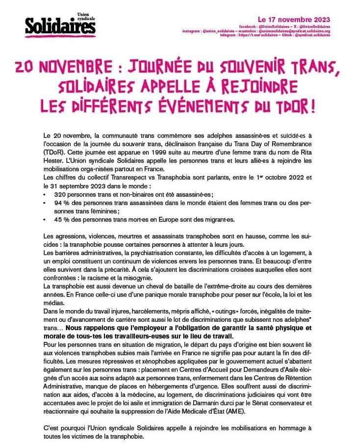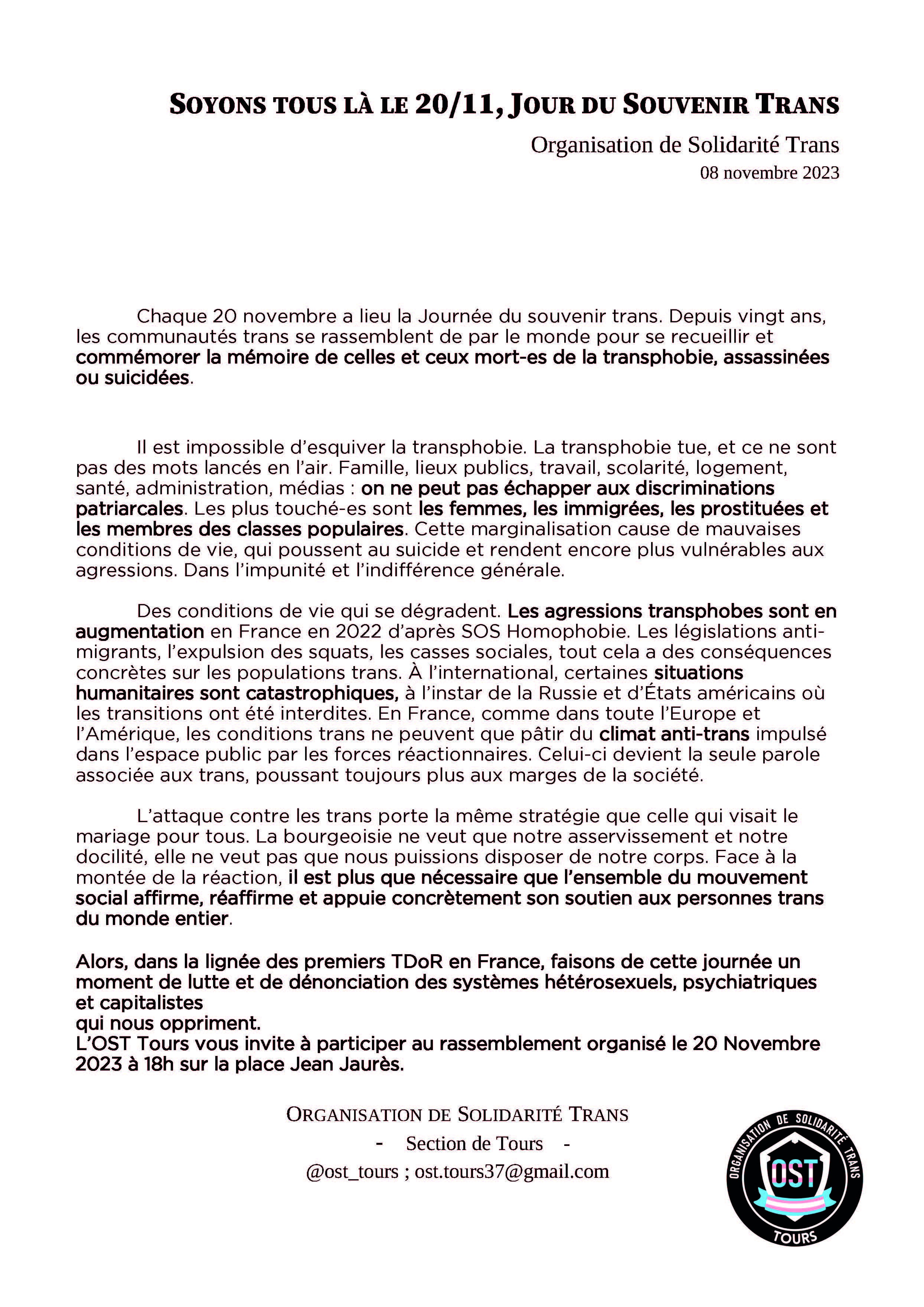 SOYONS TOUSTES LÀ LE 20/11, JOUR DU SOUVENIR TRANS. RDV à 18h place Jean jaurès à Tours