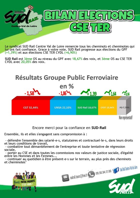 Le syndicat SUD Rail Centre Val de Loire remercie tous les cheminots et cheminotes qui lui ont fait confiance. Grace à votre vote, SUD Rail progresse aux élections du Groupe Public Ferrovière (+1,39%) et aux élections CSE TER CVDL (+6,90%)
