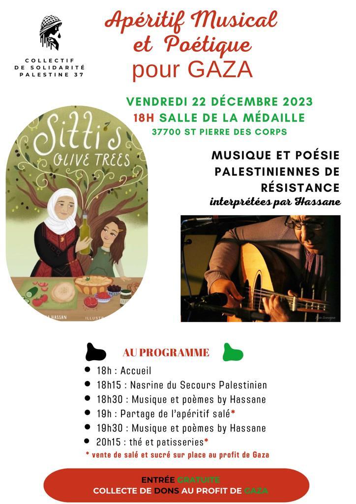 Soirée musicale et poétique pour Gaza, vendredi 22 décembre à 18h, salle de la Médaille à Saint Pierre des corps