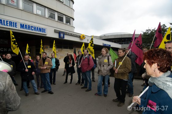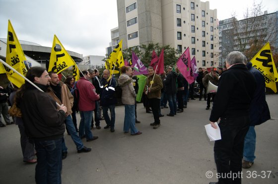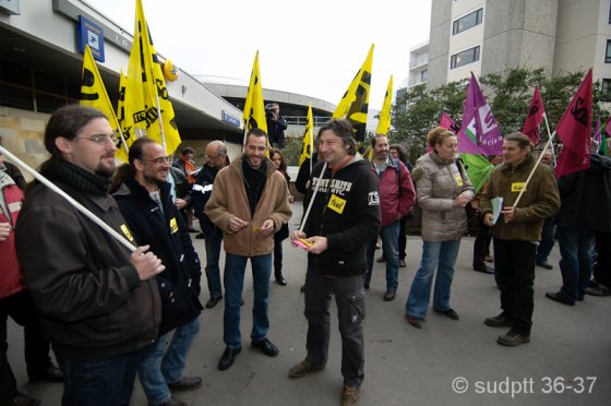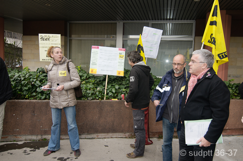 Une cinquantaine de militant(e)s se sont réunis en bas de la direction du courrier afin de soutenir Eric Ménard, représentant CHS-CT SUD-PTT au bureau de Tours Marceau, et menacé de licenciement par un conseil de discipline.
