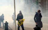 Au bout de quelques minutes, et après les sommations d’usage, la police charge le petit groupe pacifique. Avant d’avancer lourdement casqués, les forces de l’ordre lancent des grenades lacrymogènes dans les pieds des manifestants, voire à hauteur de buste pour certaines.