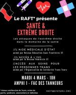 Le Réseau Antifasciste de Tours* (RAFT) organise le mardi 04 mars sur le site de l’université des Tanneurs une conférence sur les attaques de l’extrême-droite dans le domaine de la santé. Celle-ci sera dans l’amphi 1 à 18h.